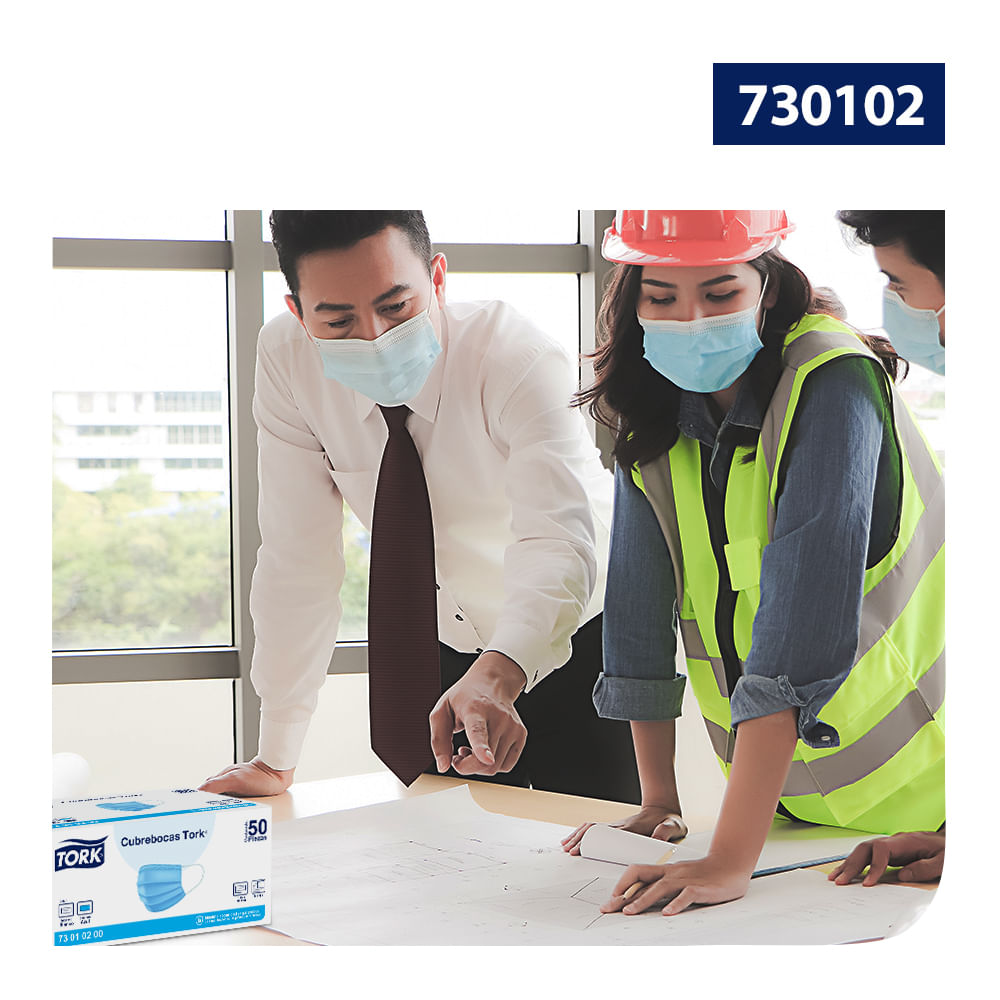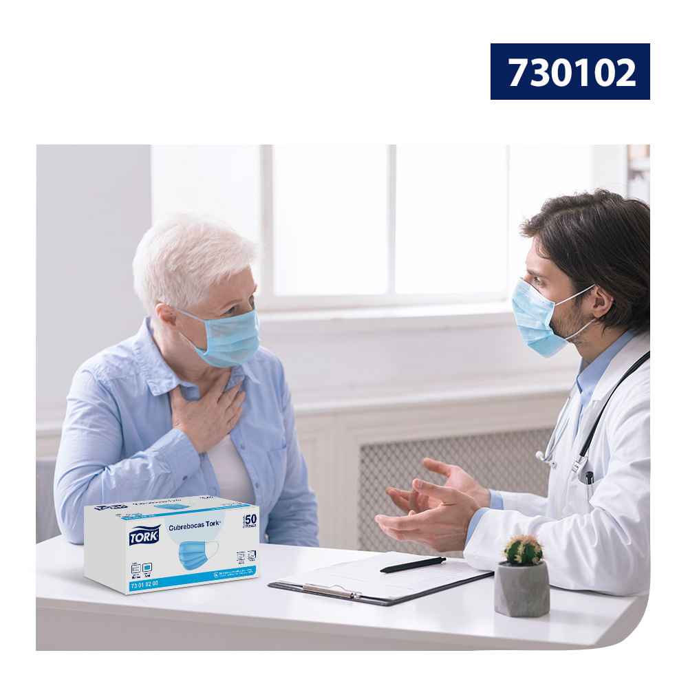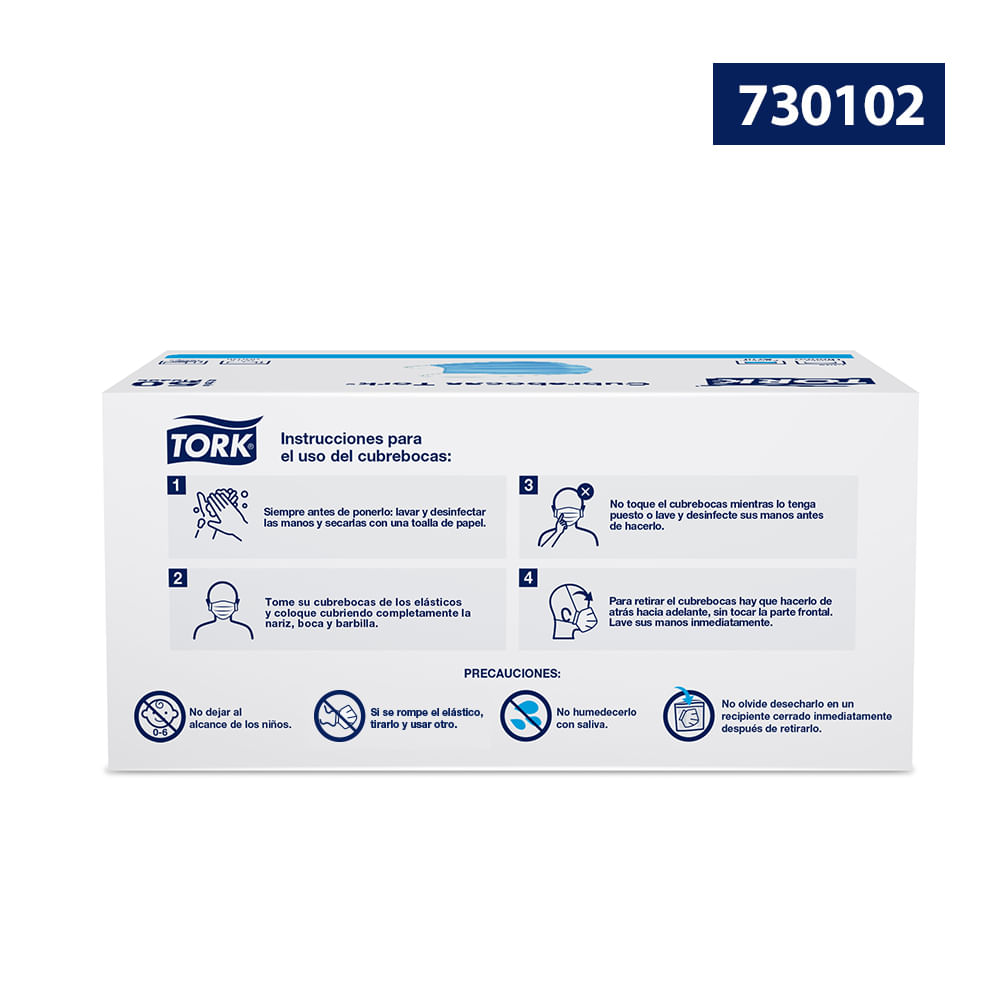 Tork® cubrebocas tipo II triple capa, plisado, de uso médico quirúrgico, simple, compuesto por 100% polipropileno, color azul, con dos elásticos a las orejas y una barra de ajuste que permiten cubrir la nariz y boca de los usuarios, teniendo como intención de uso la contención de gotas de saliva provenientes de nariz y boca que pudieran esparcirse al hablar, estornudar o toser, siendo posibles vehículos de microorganismos, evitando de esta forma el contacto con personas y superficies aledañas.
