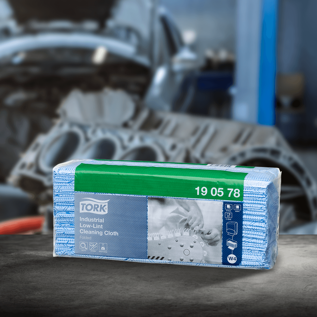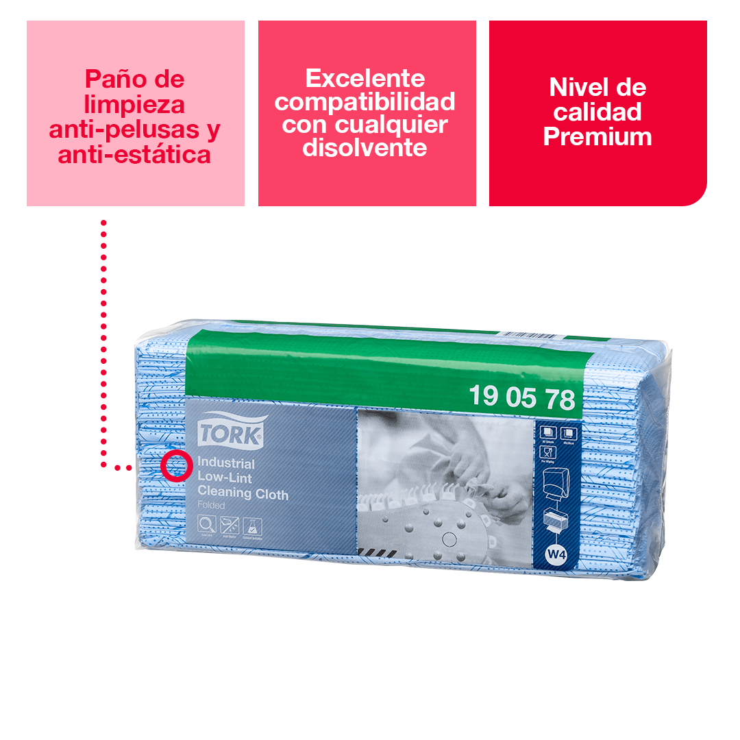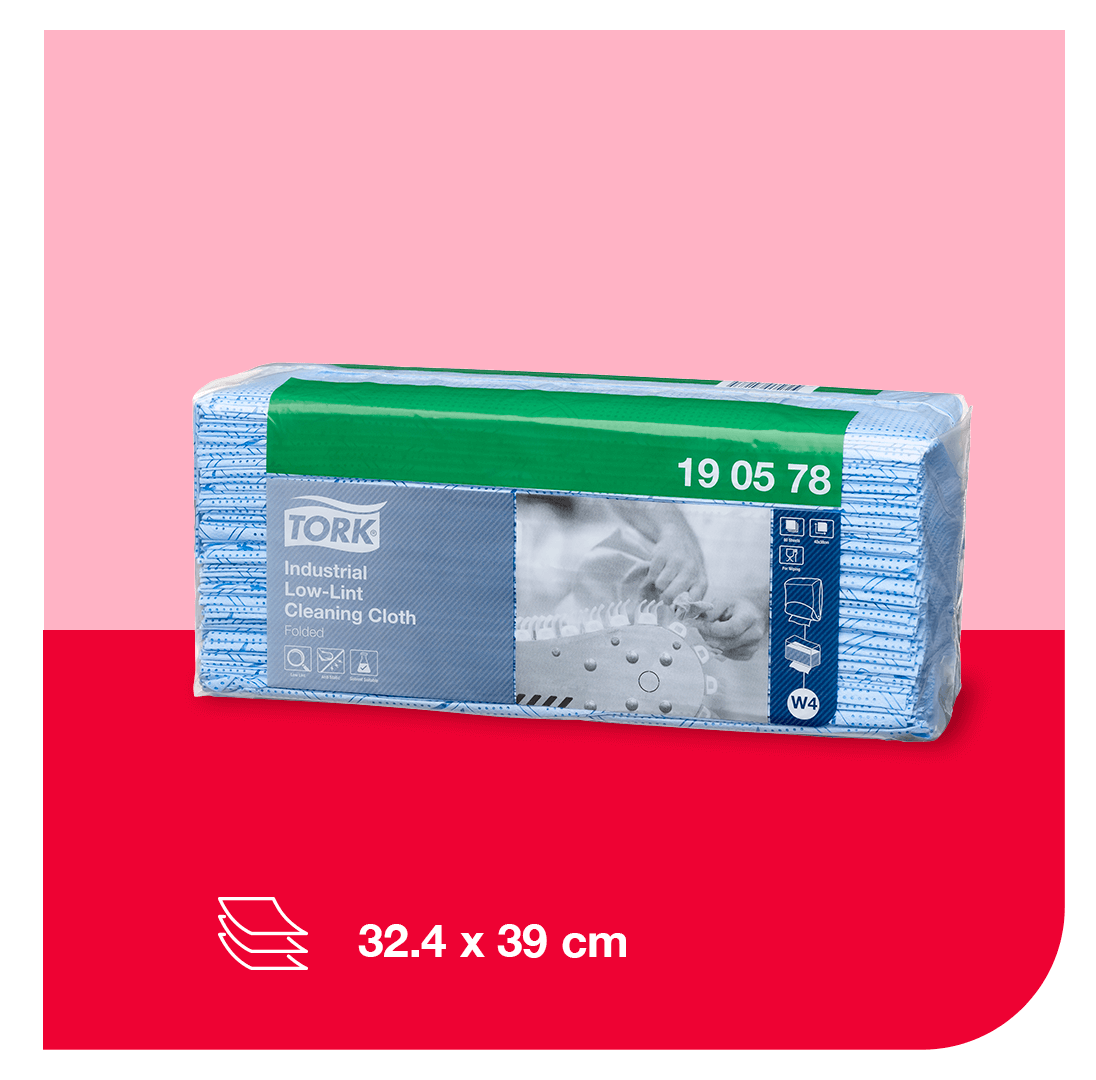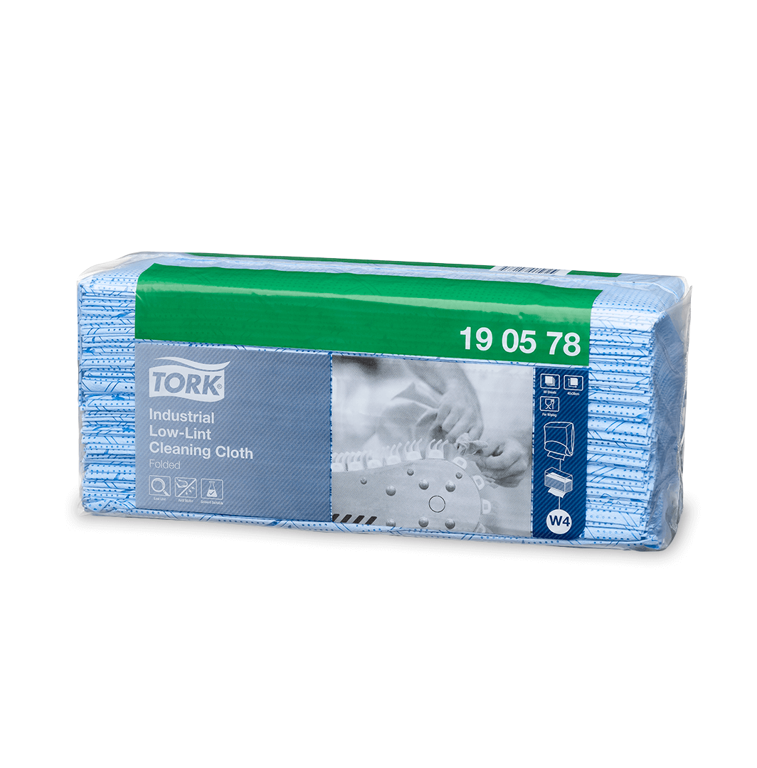 Los paños de limpieza bajos en pelusa Tork para industria están diseñados para ser extremadamente antiestáticos y se pueden usar con la mayoría de solventes. Ideal para usarse con el dispensador para paños de limpieza.