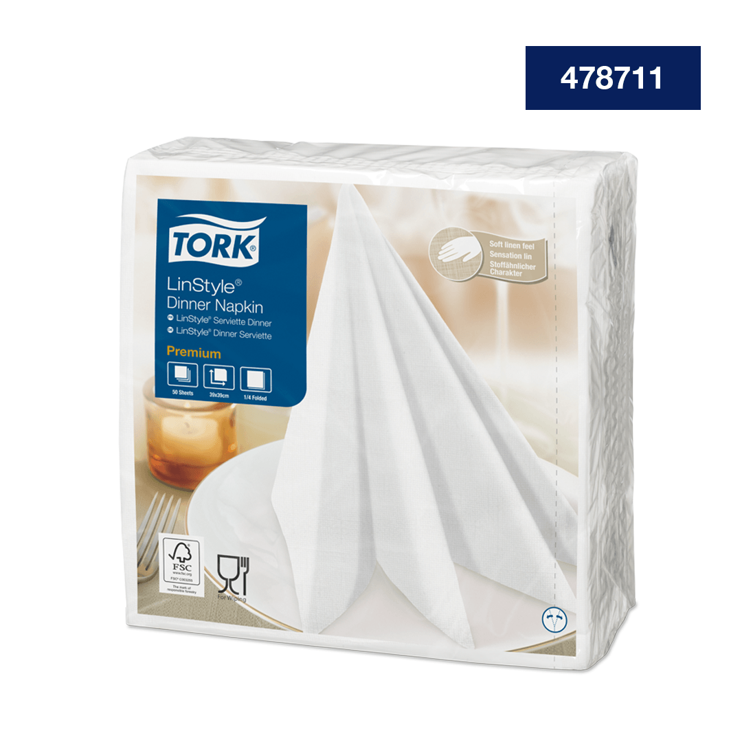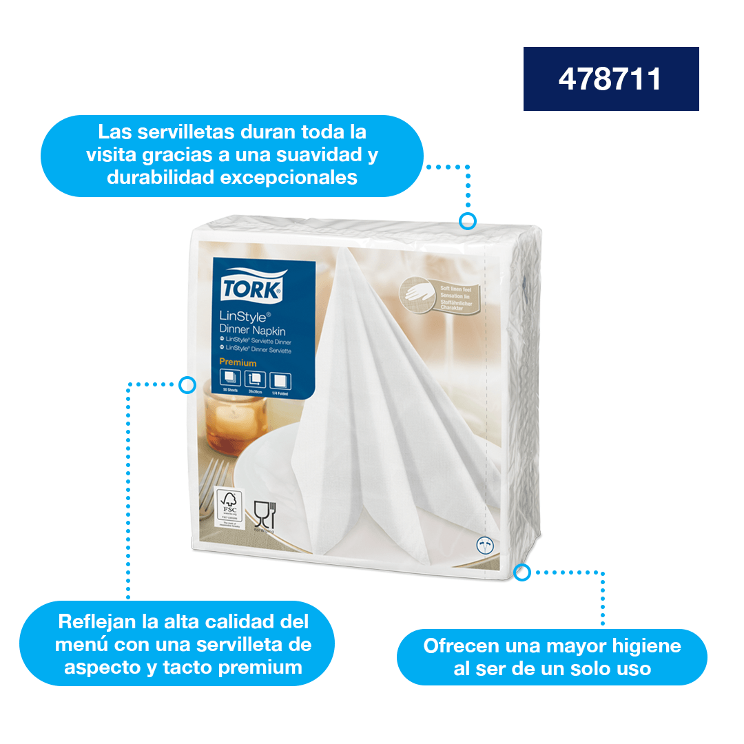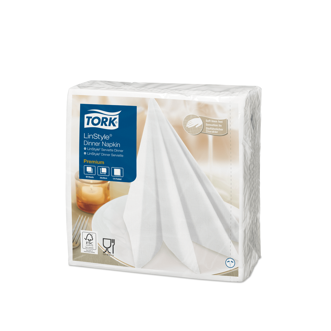 Las servilletas Tork LinStyle® son ideales para restaurantes que ofrecen un servicio completo y donde la calidad y experiencia son especialmente importante para impresionar a tus clientes. Esta servilleta de papel, brinda la sensación de tela con los beneficios de un solo uso, se caracteriza por su suavidad y durabilidad durante toda la visita. Refleja en tu mesa la elegancia con una servilleta de aspecto y tacto premium y combina tu menú con los colores correctos.