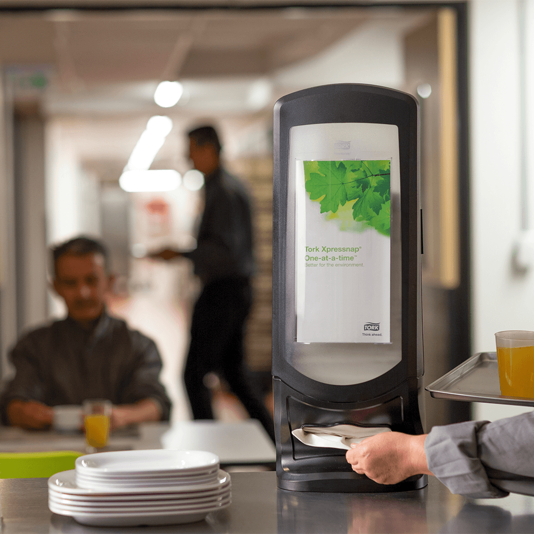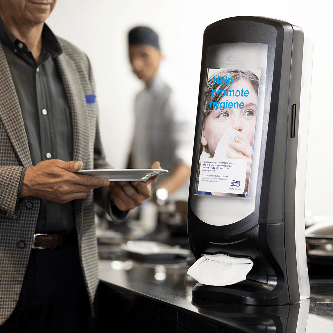 Los dispensadores Xpressnap® para sobremesa de la línea Signature en conjunto con la servilleta regular calidad Advanced es ideal para restaurantes con servicio limitado que no ofrecen servilletas en la mesa. Este compacto y moderno dispensador brinda servilletas individuales, lo que mejora la higiene y reduce el consumo de servilletas en al menos 25 %, en comparación con los sistemas tradicionales de dispensadores de servilletas. El dispensador cuenta con el espacio Ad-a-Glance para poder publicitar información de importancia para el negocio.