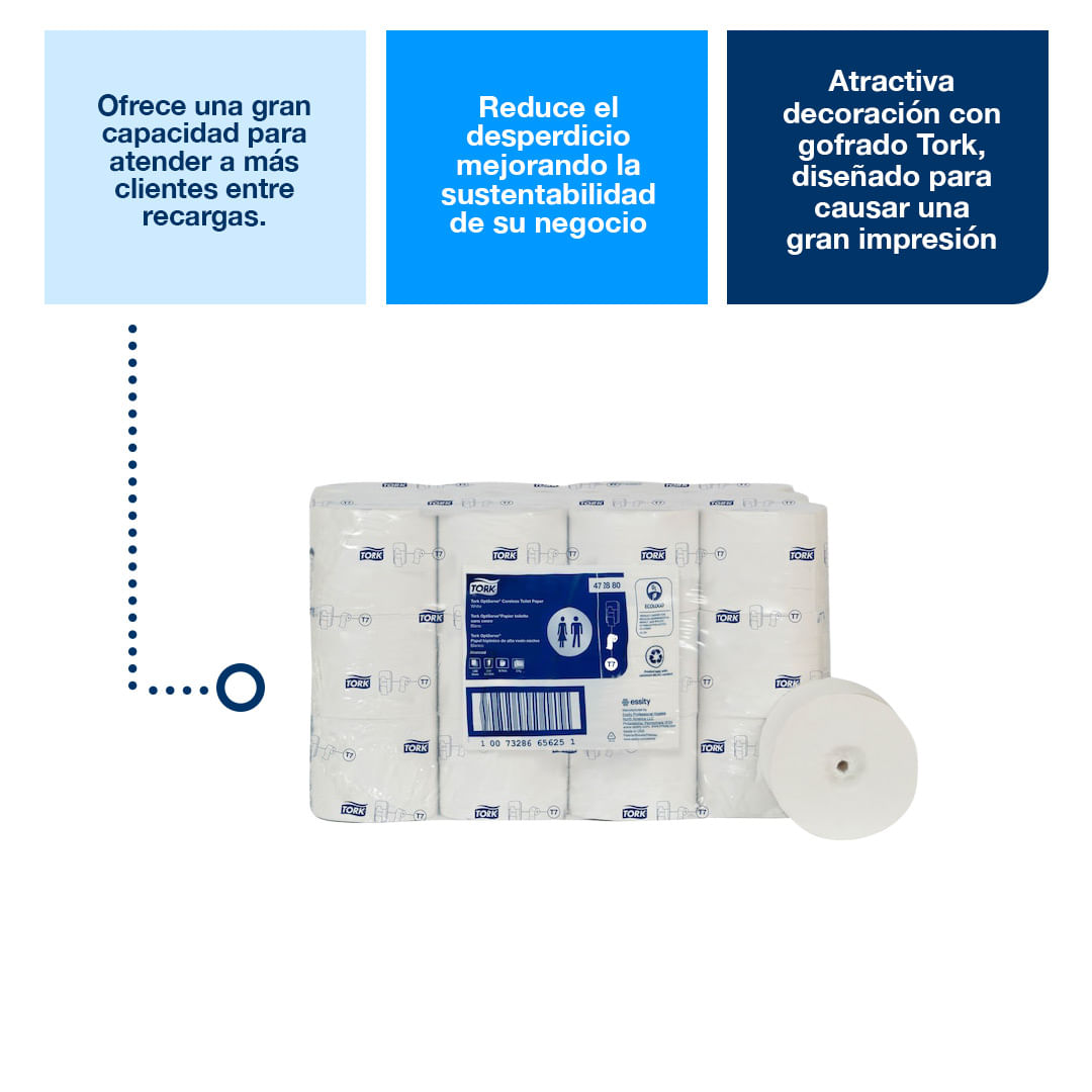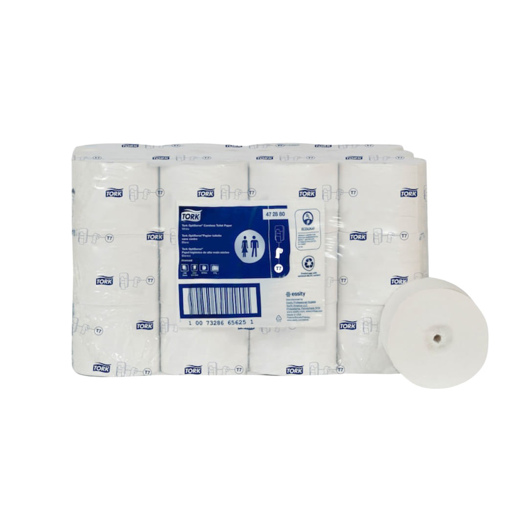 El papel higiénico Tork OptiServe® Coreless es la solución ideal para instalaciones que buscan máxima eficiencia, sostenibilidad y una experiencia superior para los usuarios. Su sistema de alta capacidad sin tubo reduce residuos, optimiza el almacenamiento y disminuye la frecuencia de recarga, superando al papel higiénico convencional y a los rollos jumbo tradicionales. Gracias a su versátil línea de dispensadores, puedes cubrir múltiples áreas dentro de una misma instalación utilizando un solo tipo de papel, simplificando la operación y reduciendo costos. Tork OptiServe® es la opción inteligente para empresas que priorizan higiene profesional, rendimiento operativo y una imagen moderna y sostenible en cada espacio.